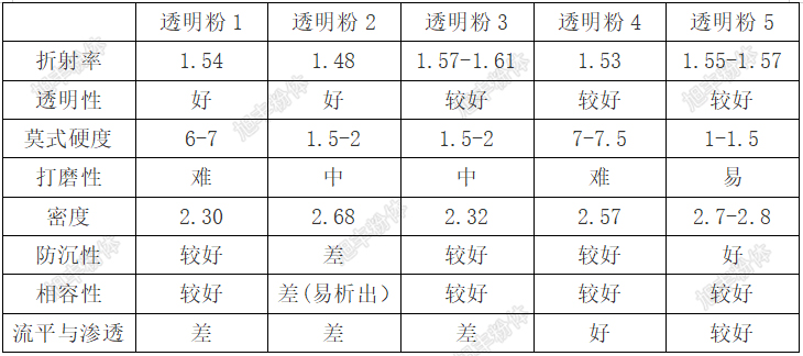 注:透明粉1、透明粉2屬于藍相,在黃光下拍照顯現的透明性稍差于透明粉3、透明粉4、透明粉5這類黃相填料。