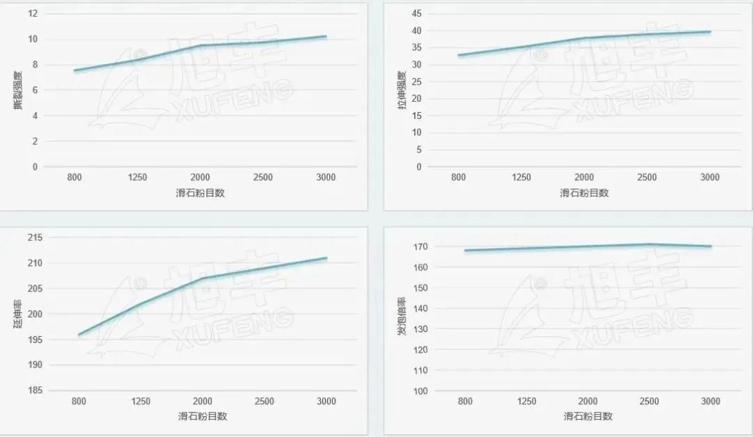 3、滑石粉的粒徑影響其強(qiáng)度,但2000目后,提升幅度較小,且較難分散,因此綜合成本及分散性考慮,選擇1250-2000目滑石粉最佳。