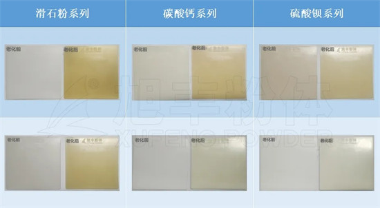 上表為不同種類的滑石粉、碳酸鈣和硫酸鋇填充PP材料在150℃,14天的烘箱中熱老熱后的樣板對比,可以看出同一種無機礦物粉體對PP熱老化的影響會有所差異,比如有些滑石粉的耐老化效果較差,而有些滑石粉具有優良的耐老化性,碳酸鈣和硫酸鋇亦是如此,因此,在選擇無機礦物粉體的種類和規格至關重要。