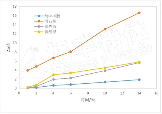 上圖是純PP樹脂、滑石粉填充PP、碳酸鈣填充PP和硫酸鋇填充PP在150℃的烘箱中老化實驗,隨著熱老化天數的增加,其Δb值(耐黃變)的變化。由圖可知: