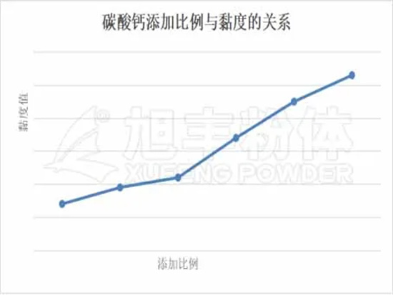 測試結果表明,隨著碳酸鈣添加量的增加,黏度值先緩慢增加,再快速上升。選擇合適的比例,可以調節膠粘劑的粘性與流動狀態,使其達到最佳施工黏度。