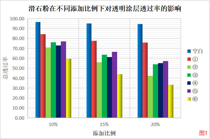使用霧度儀ISO標(biāo)準(zhǔn),測(cè)試400-700nm波長下,不同滑石粉涂層的總透過率(透光能力)數(shù)據(jù)如上圖1,①滑石粉添加至20%對(duì)涂層的透過率影響明顯較小,而其他滑石粉在添加至15%左右就出現(xiàn)較大幅度透過率降低等問題;②和⑥款屬于霧面型滑石粉,其透光率又表現(xiàn)出遠(yuǎn)低于其他滑石粉的水平;